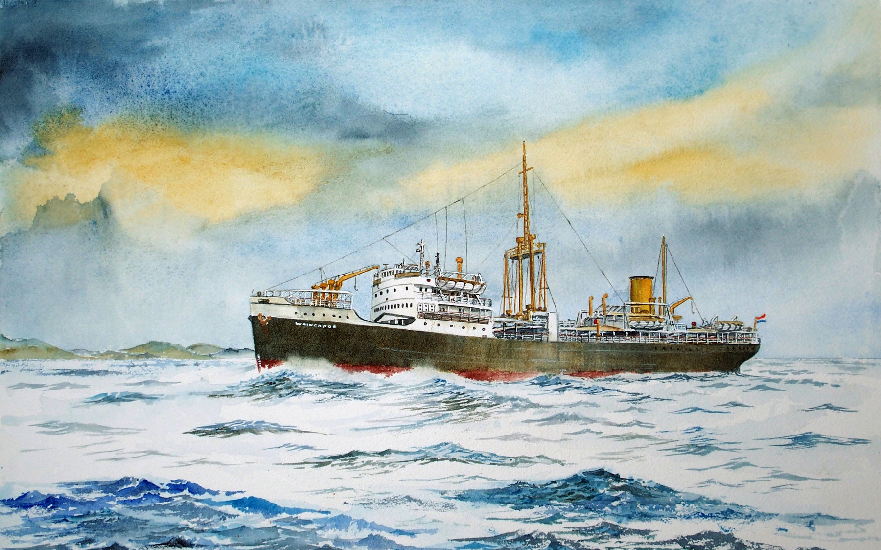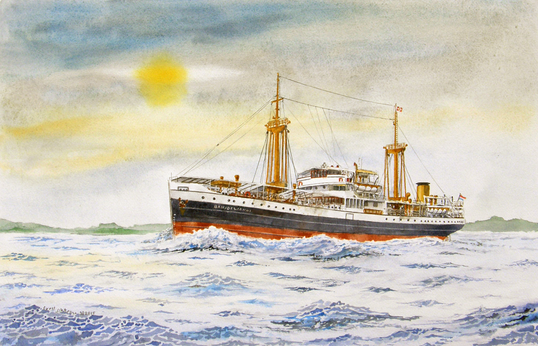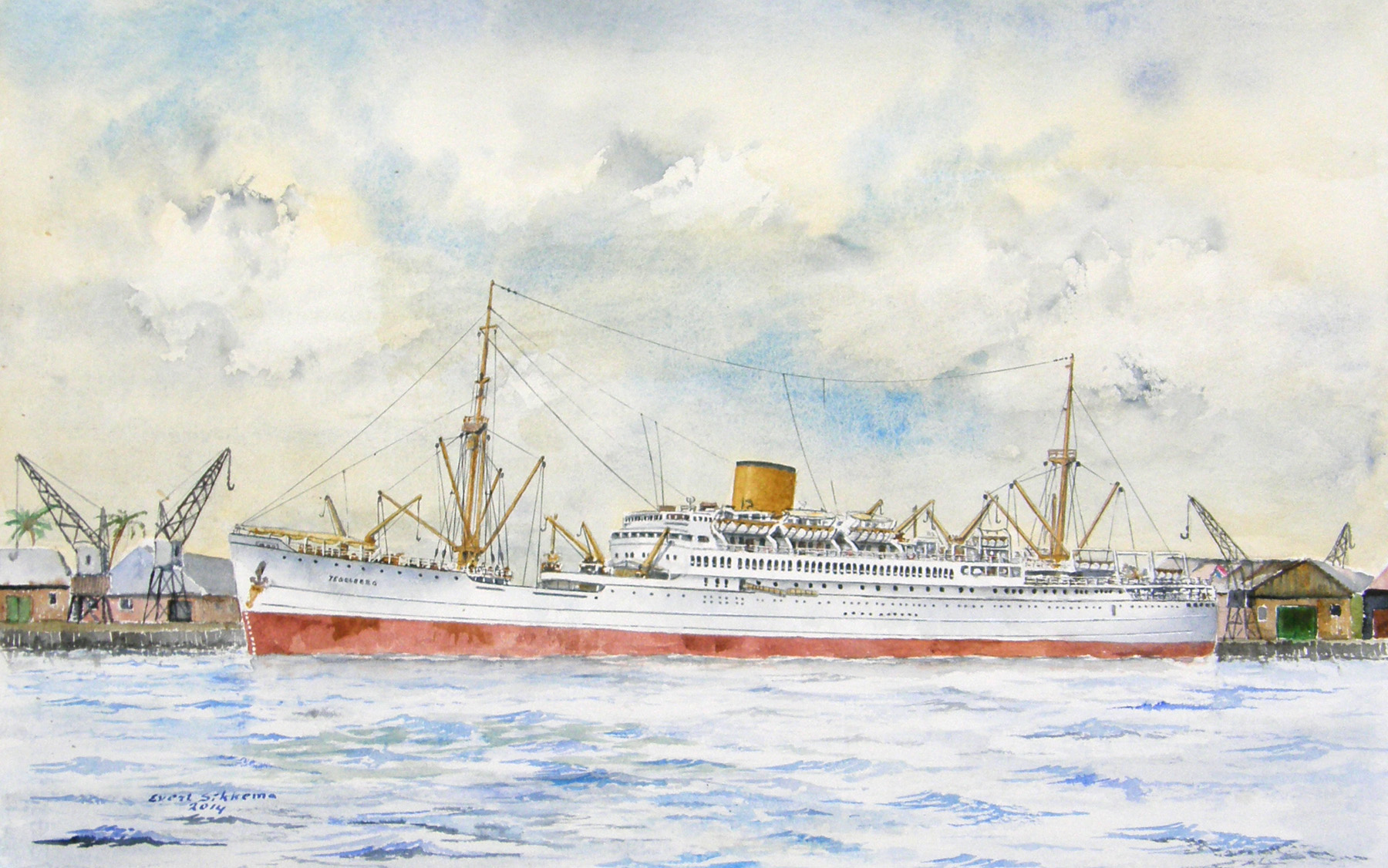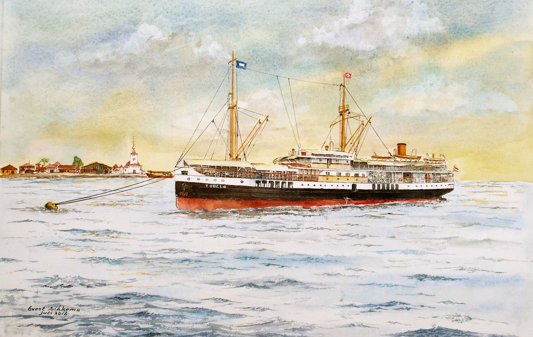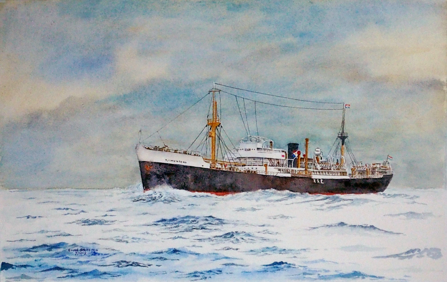 De Waikelo heeft Evert al eens eerder geschilderd, maar deze was voor de winnaar van de verloting bij de viering van het 90 jarig bestaan van de Vereniging van oud medewerkers van de KPM. Voor dezelfde bijeenkomst (varend vanuit Vlaardingen) was de Tegelberg bestemd.